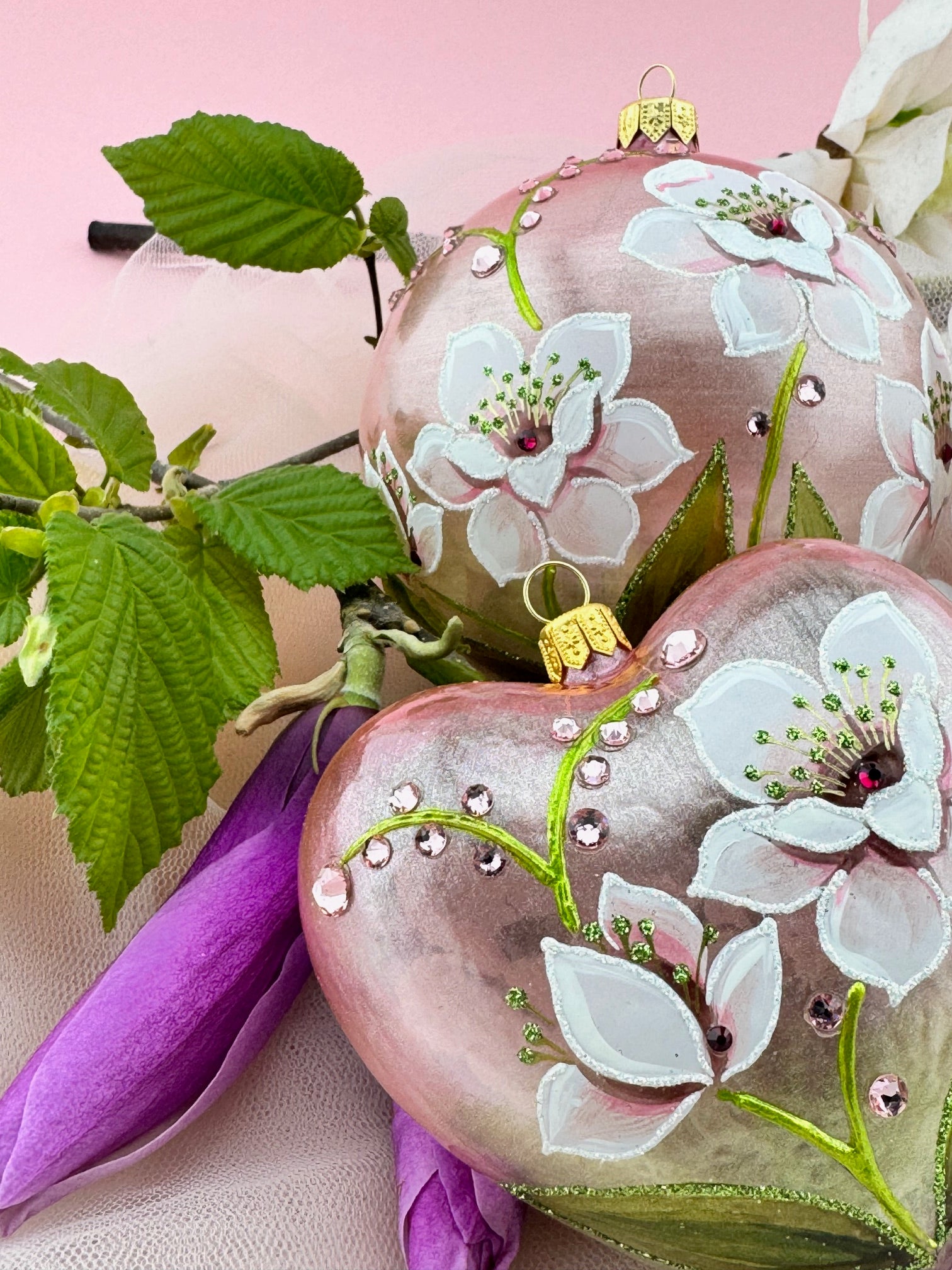 Eine zart rosafarbene, transparente Glaskugel bildet die Bühne für ein florales Motiv, das sich in feiner Eleganz darüber entfaltet. Magnolienblüten – anmutig, leicht und beinahe schwebend – ziehen sich über die Oberfläche und verleihen dem Design eine stille Lebendigkeit. Je nach Lichteinfall verändern sich Tiefe und Ausdruck, sodass die Kugel immer wieder neue Facetten offenbart.