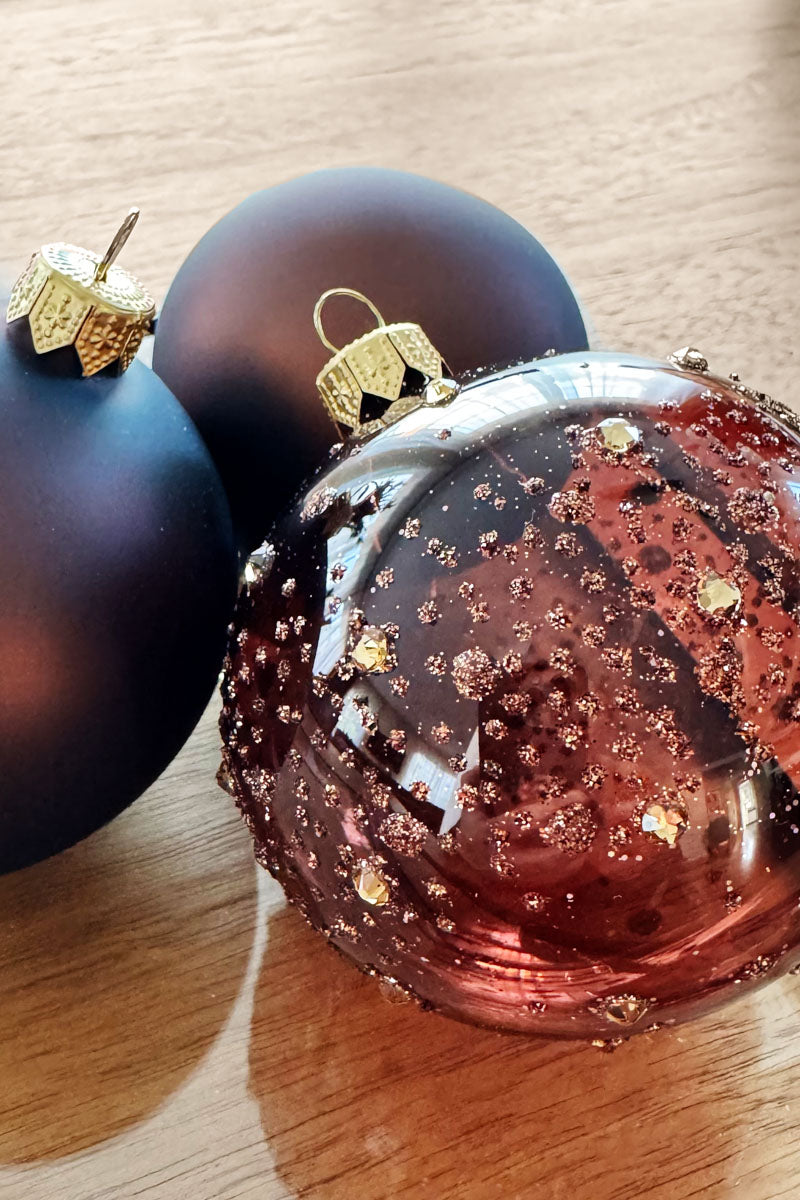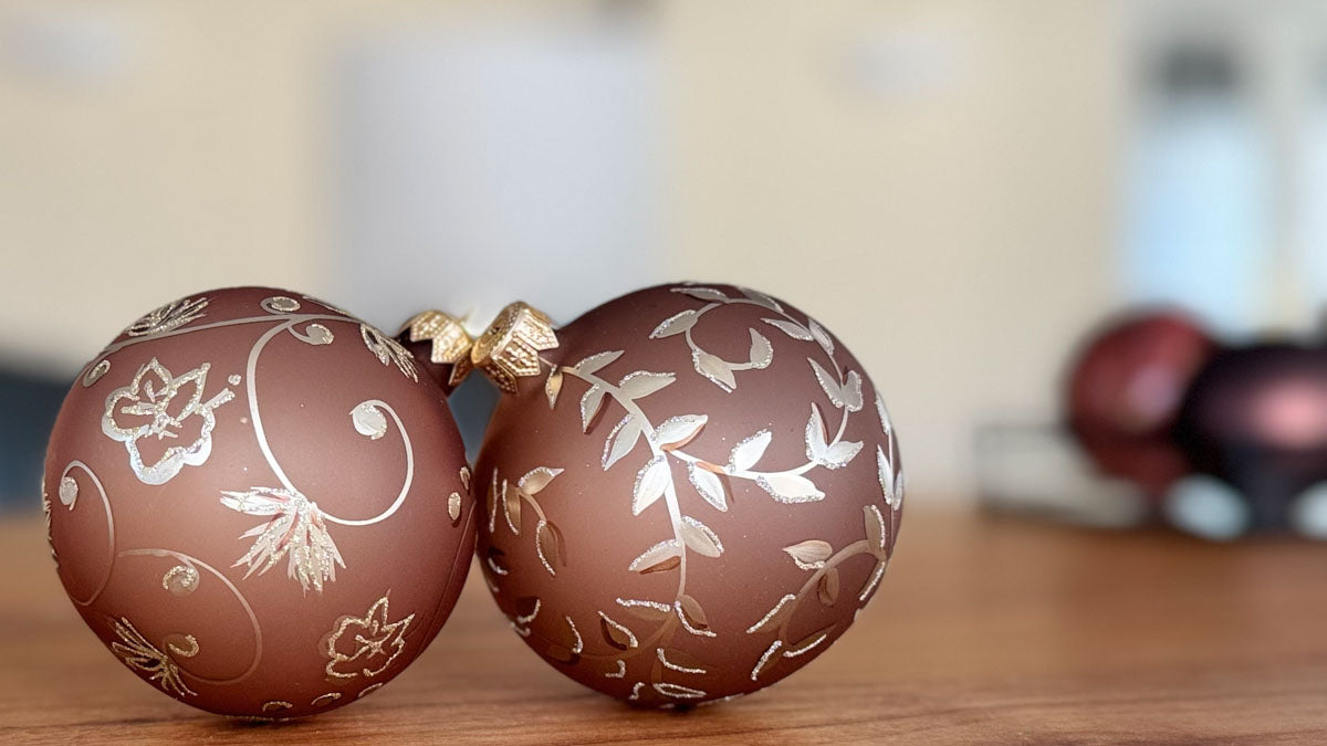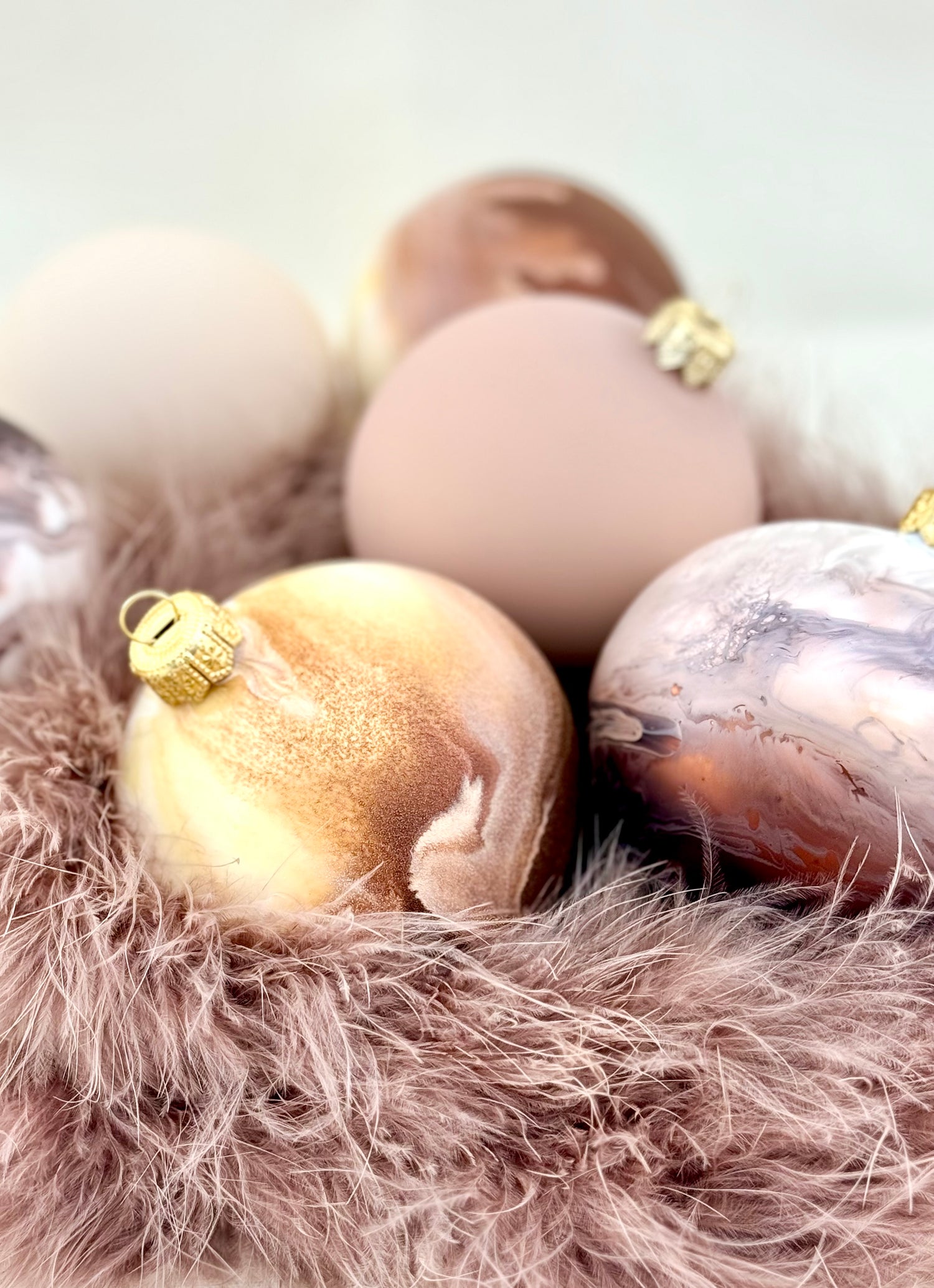 Weiche und sanfte Beige-Töne vermischen sich mit braunen Farbnuancen wie in einem Becher Milchkaffee oder heißer Schokolade. Diesen Mischvorgang haben wir auf der Oberfläche der Kugeln festgehalten und mit Ihnen eine wunderbare helle und freundliche Weihnachtsdekoration zusammengestellt.