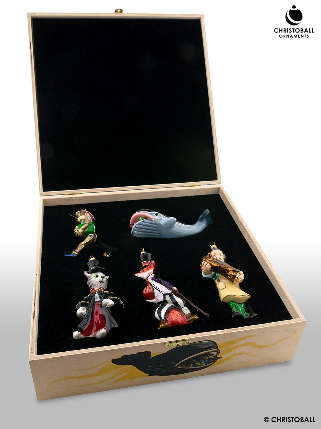 Eine zauberhafte nostalgische Sammlung mit 5 Ornamenten aus der Pinocchio-Kollektion. Alles ist wunderbar, mit viel Liebe zum Detail bemalt. Auch die spezielle Holz-Schatulle wurde liebevoll künstlerisch gestaltet und beherbergt die edlen Stücke im ausgestanzten Samt-Schwamm. Eine Kollektion, die viele Sammlerherzen höher schlagen läßt.