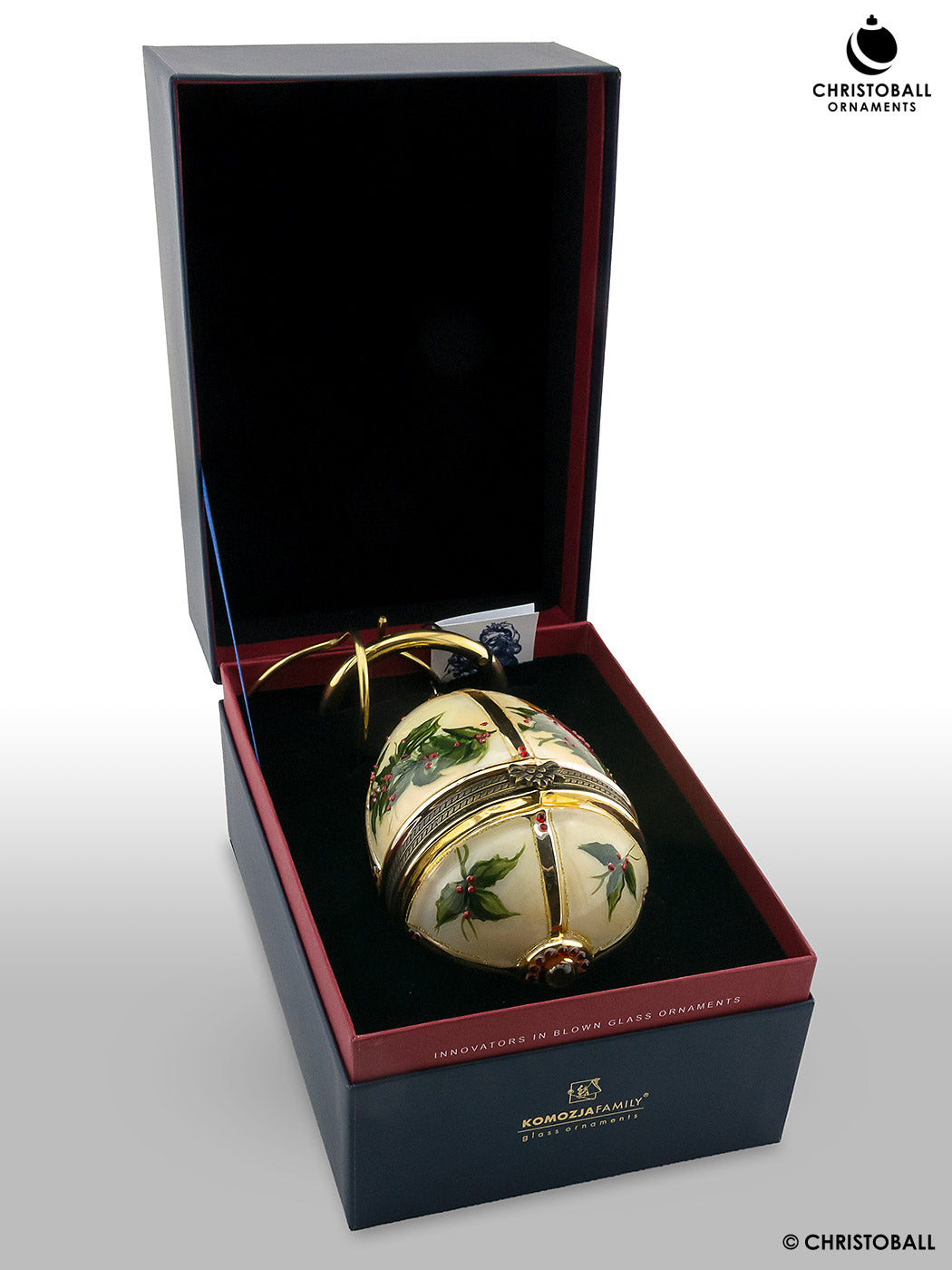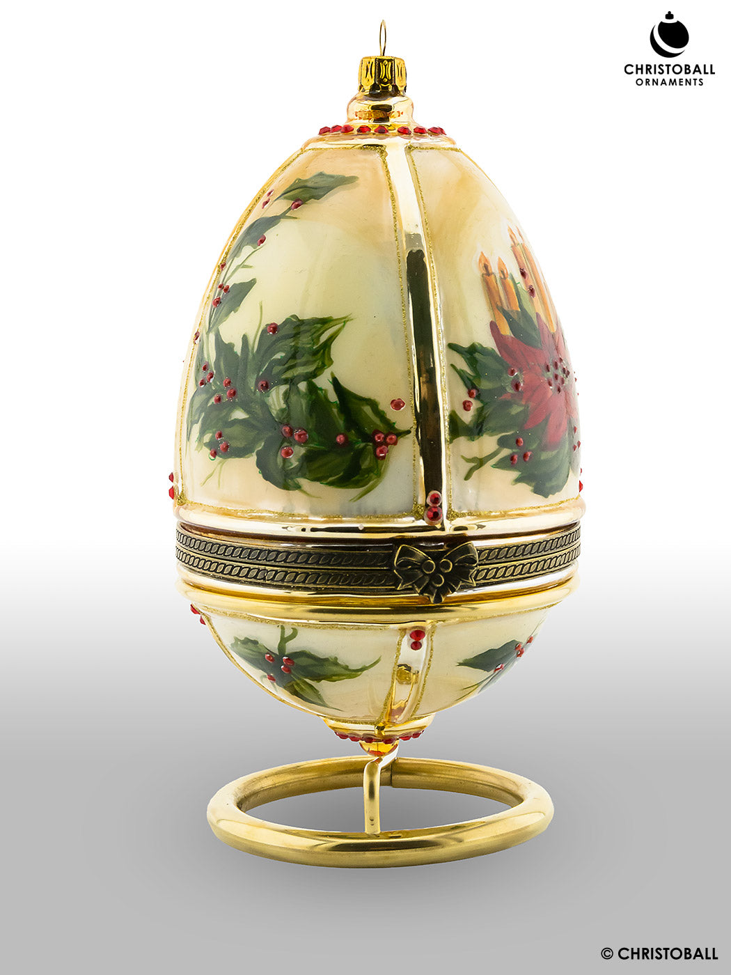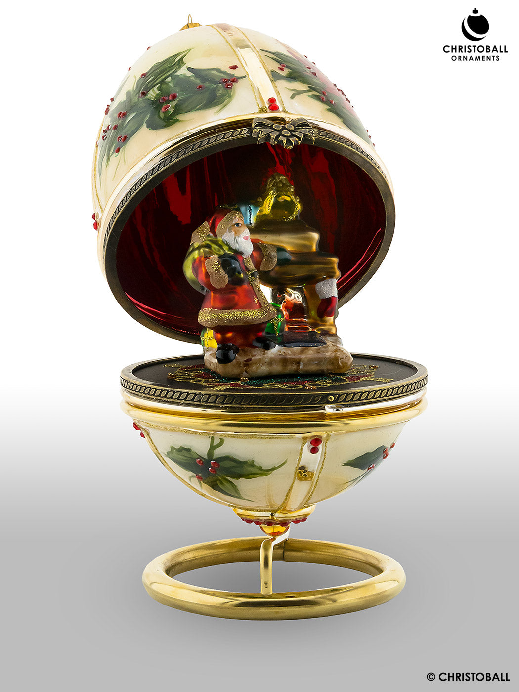 Die äußere Schale ist aufwendig bemalt und zeigt weihnachtliche Blumen-Motive. Die gesamte Schale ist mit 49 roten original Swarovski-Kristallen dekoriert. Das Ei hat in der Mitte einen Ring zum Verschließen. Nach dem Öffnen entdecken Sie den Weihnachtsmann, der am Kamin steht. Die Innenseite der Schale ist rot glänzend, so dass ein warmes rotes Licht um die Szene strahlt.